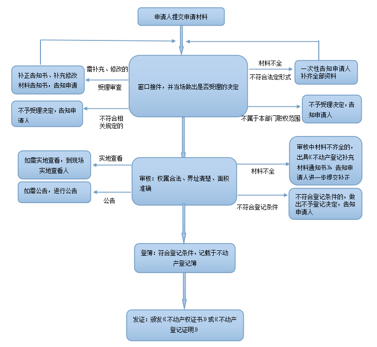 3.審核:權屬合法、界址清楚、面積準確;如需實地查看,到現場實地查看;如需公告,進行公告;審核中材料不齊全的,出具《不動產登記補充材料通知書》,告知申請人進一步提交補正