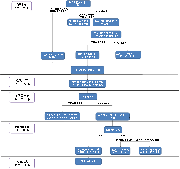 申請人現場或郵寄提交書面申請材料,經自然資源部接受并審查后,對符合受理條件的出具《受理通知書》;屬于部受理范圍、不符合申請條件的,政務大廳告知申請人接收要求;不屬于部審批權限范圍的或國家政策規定暫停受理審批的,政務大廳經部授權可出具《不予受理決定書》。