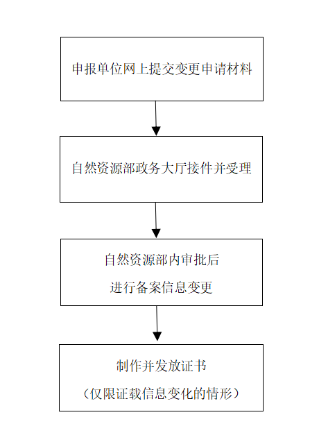 申請單位通過“國土空間規劃行業管理信息系統”的“資質證書信息變更”模塊申請變更,在線填報申請資料,上傳附件材料,提交申報申請;部政務大廳接件并受理。