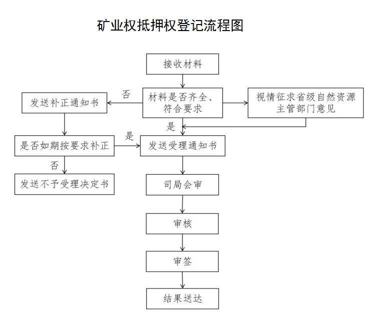 自然資源部政務大廳接收申請人報送的礦業權抵押權登記申請資料。申請材料齊全、符合法定形式的,或者申請人按照登記管理機關的要求提交全部補正申請材料的,應當受理登記申請。