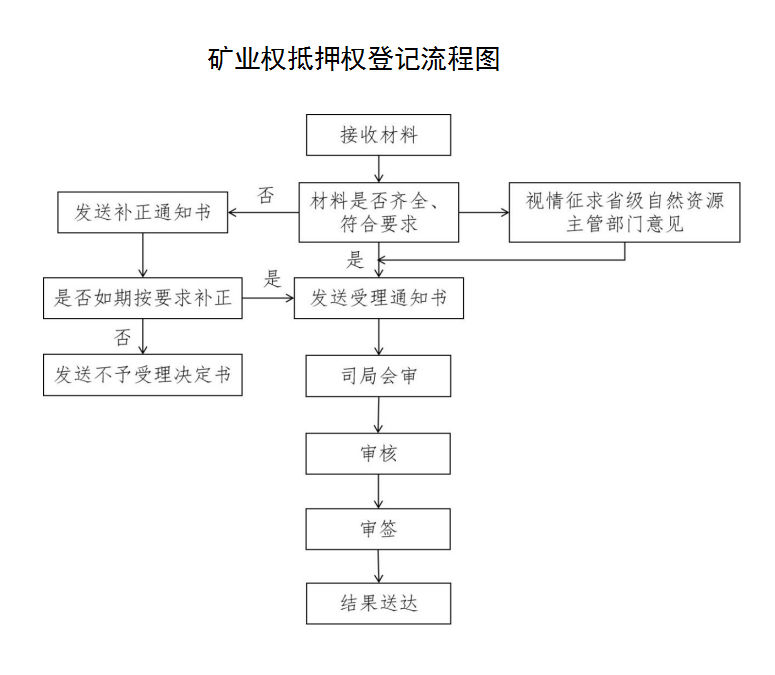 自然資源部政務大廳接收申請人報送的礦業權抵押權登記申請資料。申請材料齊全、符合法定形式的,或者申請人按照登記管理機關的要求提交全部補正申請材料的,應當受理登記申請。