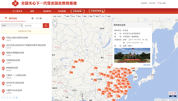 中國關工委命名的首批138個關心下一代黨史國史教育基地線上平臺現已全部啟動,該平臺迎合了青少年作為“網絡一代”對多渠道信息獲取的需要,是中國關工委加強網絡建設的一個有力舉措。同步推出的PC端和移動端的全國關心下一代黨史國史教育基地網絡地圖,在線集中展示了中國關工委認真貫徹習近平總書記關于“在廣大青少年中開展深入、持久、生動的愛國主義宣傳教育”的重要指示精神和深入開展“傳承紅色基因,爭做時代新人”主題教育活動成果。