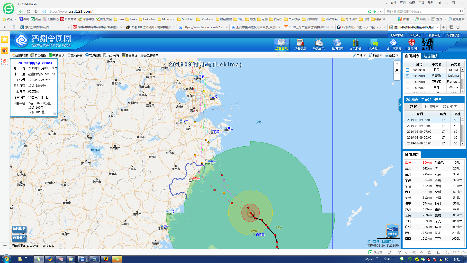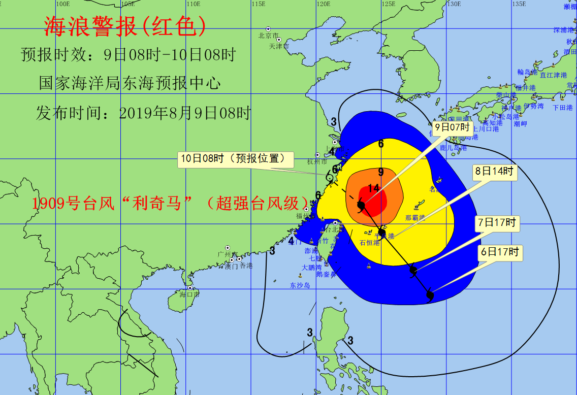 東海預報中心預報室主任王華介紹說,“利奇馬”已于9日09時抵達浙江溫州東南約300公里的海面上,中心最大風力高達17級(58米/秒),溫州外海的十米大型浮標今天9點實測到最大波高達13.2米。預計未來“利奇馬”繼續向西北方向以每小時15公里的速度移動,將于10日凌晨在浙江溫州至臺州一帶登陸,登陸時中心最大風力仍將高達14-15級,甚至更高。將對浙江中南部沿海造成極其嚴重的災害。