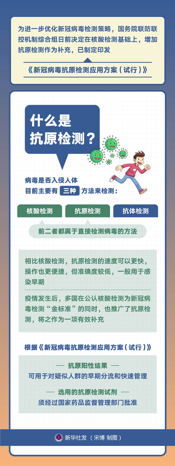 為進一步優化新冠病毒檢測策略,國務院聯防聯控機制綜合組日前決定在核酸檢測基礎上,增加抗原檢測作為補充,已制定印發《新冠病毒抗原檢測應用方案(試行)》。