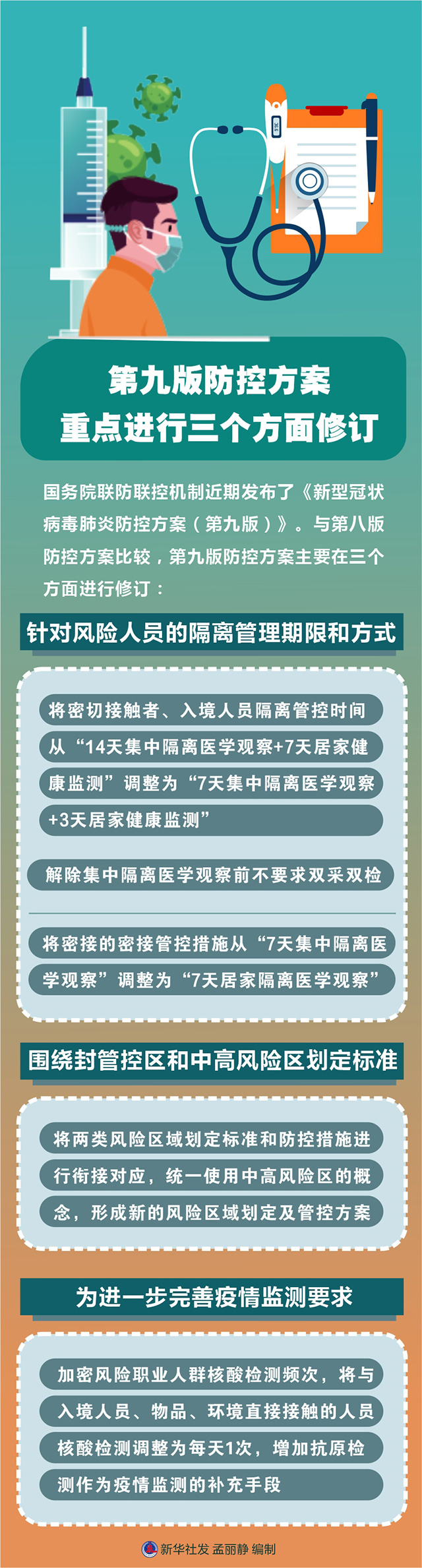 為進(jìn)一步提高疫情防控的科學(xué)性、精準(zhǔn)性,國務(wù)院聯(lián)防聯(lián)控機(jī)制近期發(fā)布了《新型冠狀病毒肺炎防控方案(第九版)》。國家衛(wèi)生健康委疾控局相關(guān)負(fù)責(zé)人提醒,第九版防控方案決不是放松防控,而是要求更規(guī)范、更準(zhǔn)確,把該管住的重點(diǎn)風(fēng)險(xiǎn)管住、該落實(shí)的措施落實(shí)到位。與第八版防控方案比較,第九版防控方案主要在三個方面進(jìn)行修訂。