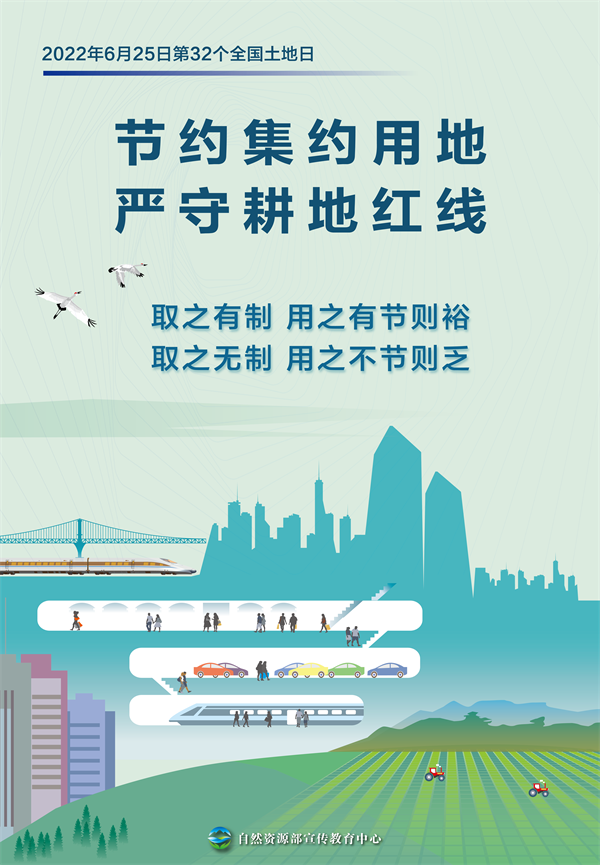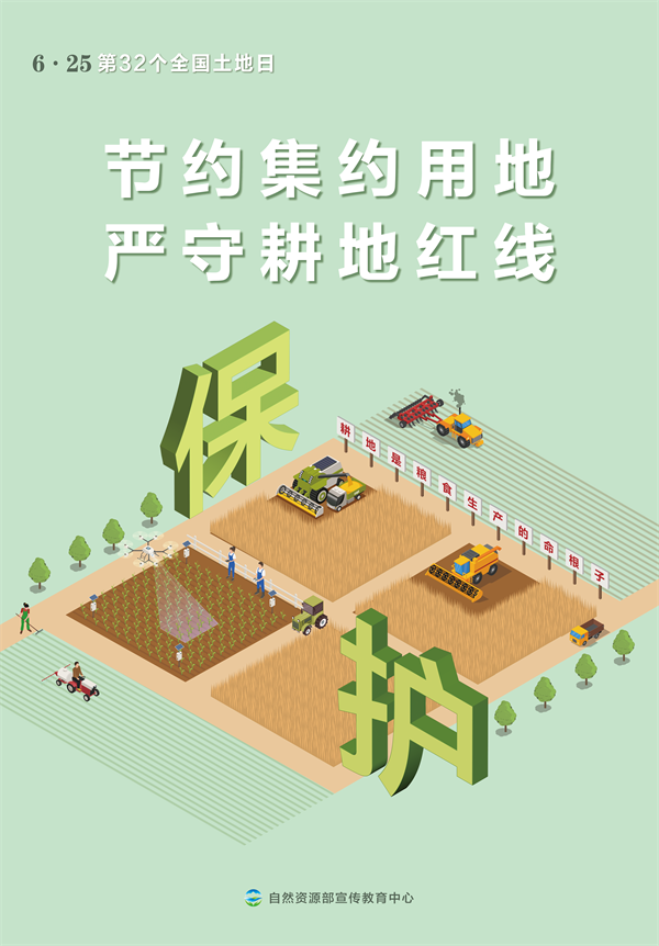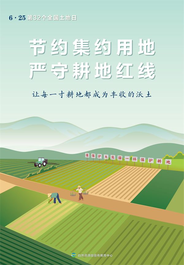2022年6月25日是第32個全國土地日,6月23日至6月29日是全國土地日主題宣傳活動周,今年的宣傳主題是“節約集約用地 嚴守耕地紅線”。值此之際,自然資源部宣傳教育中心策劃制作了4組宣傳海報,希望全社會樹立節約用地、保護耕地的意識,像保護大熊貓一樣保護耕地,讓每一寸土地都成為豐收的沃土。