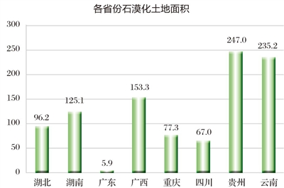 截至2016年底,巖溶地區(qū)石漠化土地總面積為1007萬公頃,占巖溶面積的22.3%,占區(qū)域國土面積的9.4%,涉及湖北、湖南、廣東、廣西、重慶、四川、貴州和云南8個?。ㄗ灾螀^(qū)、直轄市,以下簡稱?。?57個縣(市、區(qū),以下簡稱縣)。