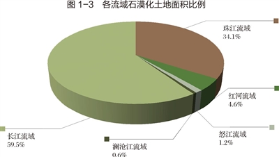 長江流域石漠化土地面積為599.3萬公頃,占石漠化土地總面積的59.5%;珠江流域石漠化土地面積為343.8萬公頃,占34.1%;紅河流域石漠化土地面積為45.9萬公頃,占4.6%;怒江流域石漠化土地面積為12.3萬公頃,占1.2%;瀾滄江流域石漠化土地面積為5.7萬公頃,占0.6%(圖1-3)。