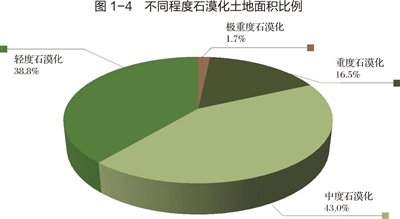 輕度石漠化土地面積為391.3萬公頃,占石漠化土地總面積的38.8%;中度石漠化土地面積為432.6萬公頃,占43%;重度石漠化土地面積為166.2萬公頃,占16.5%;極重度石漠化土地面積為16.9萬公頃,占1.7%(圖1-4)。