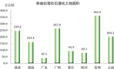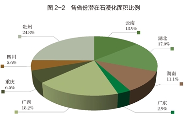 截至2016年底,巖溶地區(qū)潛在石漠化土地總面積為1466.9萬公頃,占巖溶面積的32.4%,占區(qū)域國土面積的13.6%,涉及湖北、湖南、廣東、廣西、重慶、四川、貴州和云南8個省463個縣。