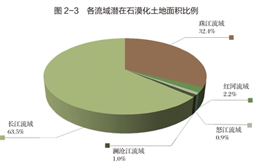 長江流域潛在石漠化土地面積最大,為931.1萬公頃,占潛在石漠化土地總面積的63.5%;珠江流域潛在石漠化土地面積為474.7萬公頃,占32.4%;紅河流域潛在石漠化土地面積為32.4萬公頃,占2.2%;怒江流域潛在石漠化土地面積為13.8萬公頃,占0.9%;瀾滄江流域潛在石漠化土地面積為14.9萬公頃,占1%(圖2-3)。