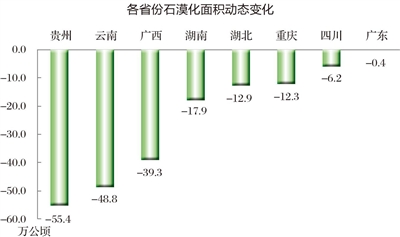 與2011年相比,8省石漠化土地面積均為凈減少。其中,貴州減少55.4萬公頃、云南減少48.8萬公頃、廣西減少39.3萬公頃、湖南減少17.9萬公頃、湖北減少12.9萬公頃、重慶減少12.3萬公頃、四川減少6.2萬公頃、廣東減少0.4萬公頃;面積減少率分別為18.3%、17.2%、20.4%、12.5%、11.9%、13.7%、8.5%、6.8%(圖3-1)。