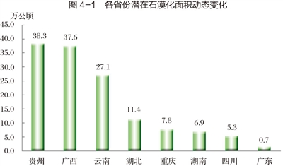 與2011年相比,潛在石漠化土地面積增加135.1萬公頃,增加了10.1%,年均增加27萬公頃(主要為石漠化土地治理后演變的)。從潛在石漠化面積變化情況來看,各省均有所增加,其中:貴州省增加面積最大,為38.3萬公頃,占潛在石漠化土地面積增加量的28.3%;其他依次為廣西37.6萬公頃,占27.8%;云南27.1萬公頃,占20%;湖北11.4萬公頃,占8.4%;重慶7.8萬公頃,占5.8%;湖南6.9萬公頃,占5.2%;四川5.3萬公頃,占3.9%;廣東0.7萬公頃,占0.6%(圖4-1)。