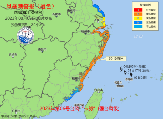 隨著臺風“卡努”最大影響我國沿岸的時段臨近,預計8月3日上午至4日中午,江蘇南通到福建廈門沿海將出現50到120厘米的風暴增水。上海市、浙江省嘉興市、紹興市、寧波市、舟山市、臺州市、溫州市和福建省寧德市、福州市的風暴潮預警級別為橙色;江蘇省南通市、福建省泉州市和廈門市的風暴潮預警級別為藍色。國家海洋預報臺提醒,由于受臺風影響岸段的天文潮較高,需要重點關注夜間沿海的天文大潮時段。國家海洋預報臺將密切關注,同時提醒沿海政府及相關部門按照職責做好防御風暴潮的應急準備工作。
