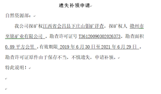 江西省會昌縣下莊山鉬礦詳查探礦權,勘查許可證號: T36120090302026373,發證機關為江西省自然資源廳。探礦權人贛州市至銘礦業有限公司將該勘查許可證不慎遺失,現向我部申請遺失補領(補領申請見附件)。