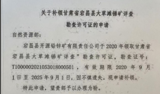 甘肅省宕昌縣大草灘銻礦詳查探礦權,勘查許可證號: T1000002021053018000501,發證機關為自然資源部。探礦權人宕昌縣開源鉛鋅礦有限責任公司將該勘查許可證不慎遺失,現向我部申請遺失補領(補領申請見附件)。