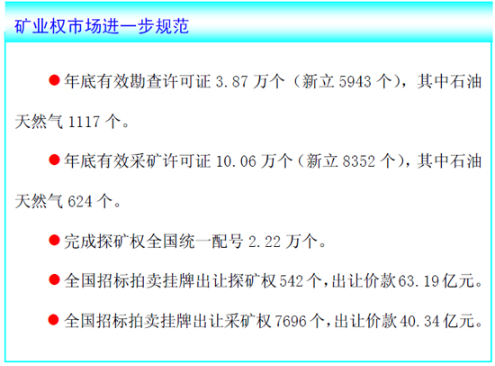● 繼續(xù)整頓和規(guī)范礦產(chǎn)資源開(kāi)發(fā)秩序,推進(jìn)礦產(chǎn)資源開(kāi)發(fā)整合,加強(qiáng)礦業(yè)權(quán)管理。