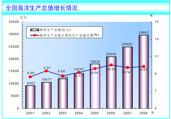 ● 2008年全國(guó)海洋生產(chǎn)總值29662億元,比上年增長(zhǎng)11%,海洋產(chǎn)業(yè)增加值17351億元,海洋相關(guān)產(chǎn)業(yè)增加值12311億元。