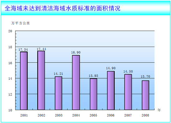 ● 全海域未達(dá)到清潔海域水質(zhì)標(biāo)準(zhǔn)的面積約13.7萬(wàn)平方公里,比上年減少約0.8萬(wàn)平方公里。