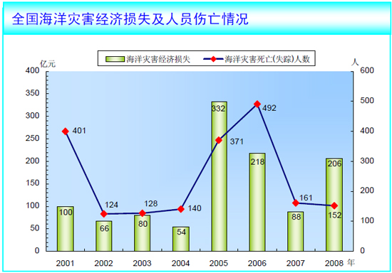 海洋災(zāi)害直接經(jīng)濟(jì)損失高于多年平均值,死亡(含失蹤)人數(shù)遠(yuǎn)低于多年平均數(shù)。