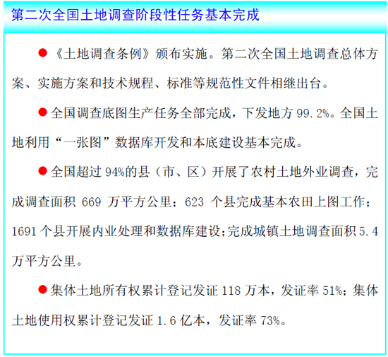 ● 國(guó)務(wù)院頒布實(shí)施《土地調(diào)查條例》,完成第二次全國(guó)土地調(diào)查階段性任務(wù)。