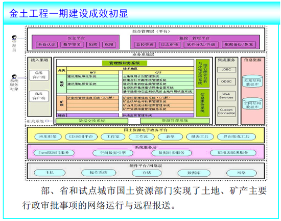 ● 推進(jìn)國(guó)土資源科技創(chuàng)新和信息化建設(shè),全面完成“金土工程”一期建設(shè)。