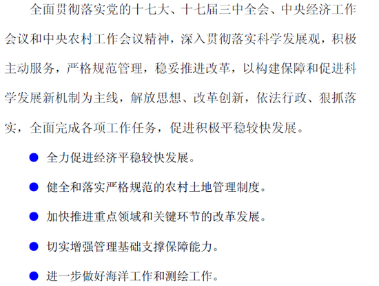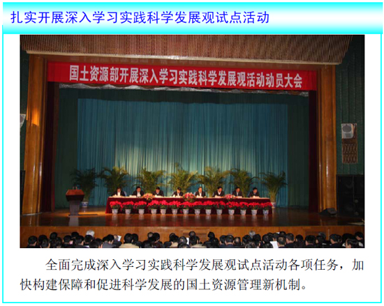 2008年,國(guó)土資源系統(tǒng)認(rèn)真學(xué)習(xí)貫徹黨的十七大、十七屆三中全會(huì)、中央經(jīng)濟(jì)工作會(huì)議和中央農(nóng)村工作會(huì)議精神,深入貫徹落實(shí)科學(xué)發(fā)展觀,扎實(shí)開(kāi)展深入學(xué)習(xí)實(shí)踐科學(xué)發(fā)展觀試點(diǎn)活動(dòng),加快構(gòu)建保障和促進(jìn)科學(xué)發(fā)展的國(guó)土資源管理新機(jī)制,國(guó)土資源調(diào)查評(píng)價(jià)、規(guī)劃、管理、保護(hù)與合理利用取得新進(jìn)展。