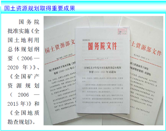 ● 國(guó)務(wù)院批準(zhǔn)實(shí)施《全國(guó)土地利用總體規(guī)劃綱要》、《全國(guó)礦產(chǎn)資源規(guī)劃》和《全國(guó)地質(zhì)勘查規(guī)劃》。
