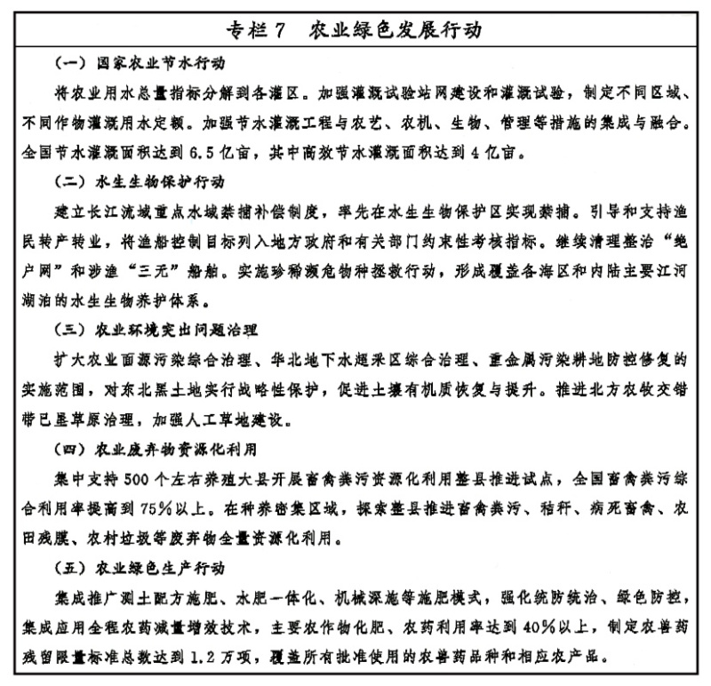 實施國家農業節水行動,建設節水型鄉村。深入推進農業灌溉用水總量控制和定額管理,建立健全農業節水長效機制和政策體系。逐步明晰農業水權,推進農業水價綜合改革,建立精準補貼和節水獎勵機制。嚴格控制未利用地開墾,落實和完善耕地占補平衡制度。實施農用地分類管理,切實加大優先保護類耕地保護力度。降低耕地開發利用強度,擴大輪作休耕制度試點,制定輪作休耕規劃。全面普查動植物種質資源,推進種質資源收集保存、鑒定和利用。強化漁業資源管控與養護,實施海洋漁業資源總量管理、海洋漁船“雙控”和休禁漁制度,科學劃定江河湖海限捕、禁捕區域,建設水生生物保護區、海洋牧場。