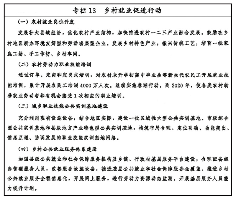 推動形成平等競爭、規范有序、城鄉統一的人力資源市場,建立健全城鄉勞動者平等就業、同工同酬制度,提高就業穩定性和收入水平。健全人力資源市場法律法規體系,依法保障農村勞動者和用人單位合法權益。完善政府、工會、企業共同參與的協調協商機制,構建和諧勞動關系。落實就業服務、人才激勵、教育培訓、資金獎補、金融支持、社會保險等就業扶持相關政策。加強就業援助,對就業困難農民實行分類幫扶。