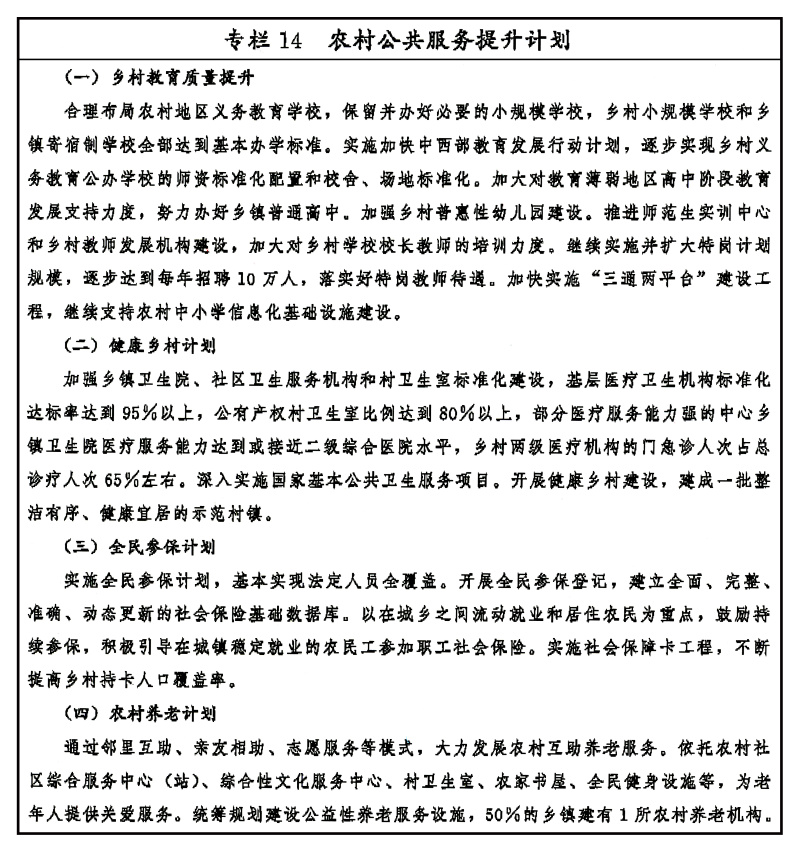 繼續把國家社會事業發展的重點放在農村,促進公共教育、醫療衛生、社會保障等資源向農村傾斜,逐步建立健全全民覆蓋、普惠共享、城鄉一體的基本公共服務體系,推進城鄉基本公共服務均等化。