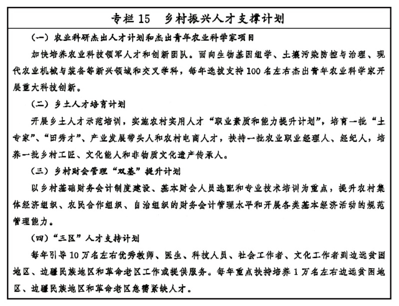 加大“三農”領域實用專業人才培育力度,提高農村專業人才服務保障能力。加強農技推廣人才隊伍建設,探索公益性和經營性農技推廣融合發展機制,允許農技人員通過提供增值服務合理取酬,全面實施農技推廣服務特聘計劃。加強涉農院校和學科專業建設,大力培育農業科技、科普人才,深入實施農業科研杰出人才計劃和杰出青年農業科學家項目,深化農業系列職稱制度改革。