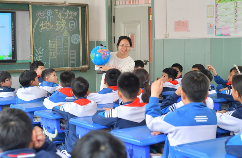 4月22日,在河南省商丘市夏邑縣育才學校,老師在地球日主題班會上為學生講解地球知識。