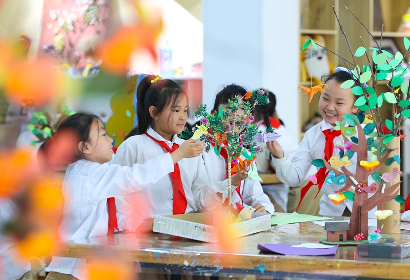 4月22日,石家莊市柏林莊學校學生在制作“環(huán)保樹”,呼吁愛護地球,低碳生活。