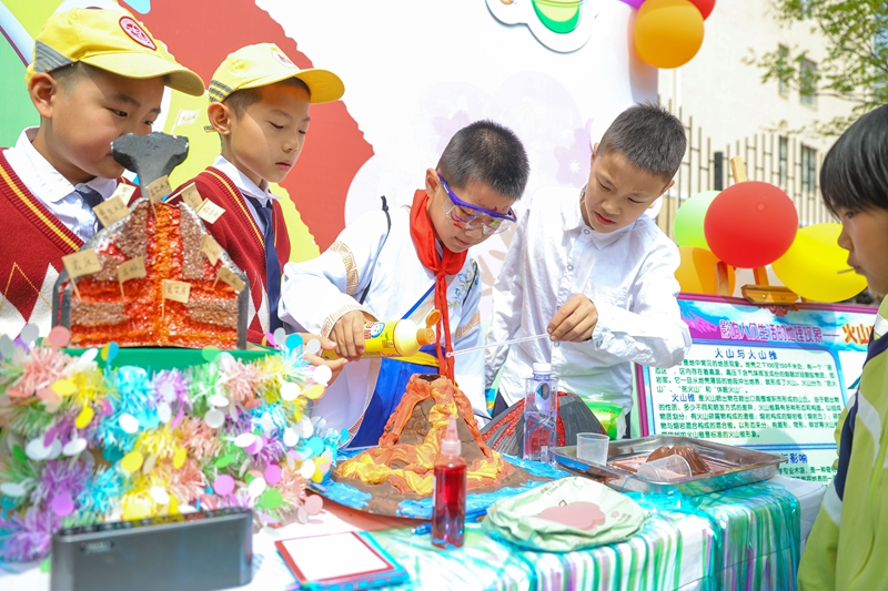 4月22日,山東青島浮山路小學學生在“珍愛地球”科普活動中體驗“火山爆發(fā)”科學實驗。