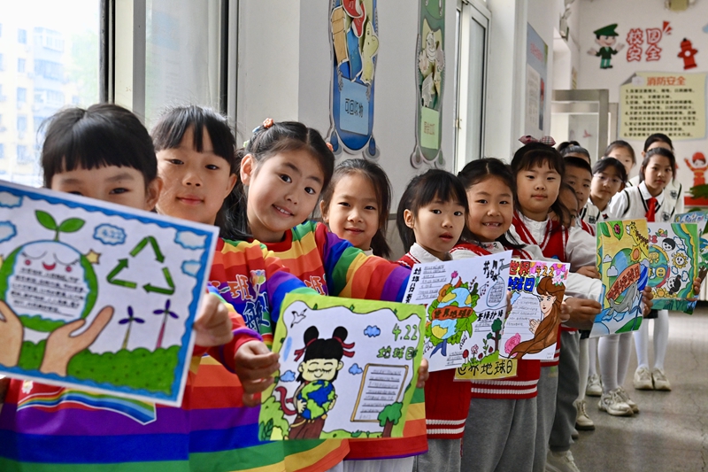 4月22日,沈陽市鐵西區(qū)保工二校學生展示自己制作的世界地球日主題手抄報。