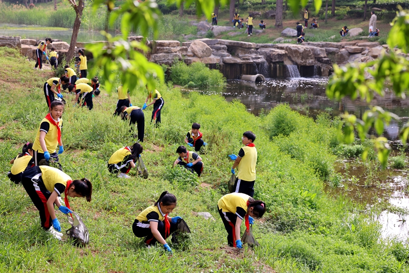 4月22日,山東省棗莊市市中區(qū)紅旗小學學生在當?shù)匚魃澈影哆吳謇砝s物。