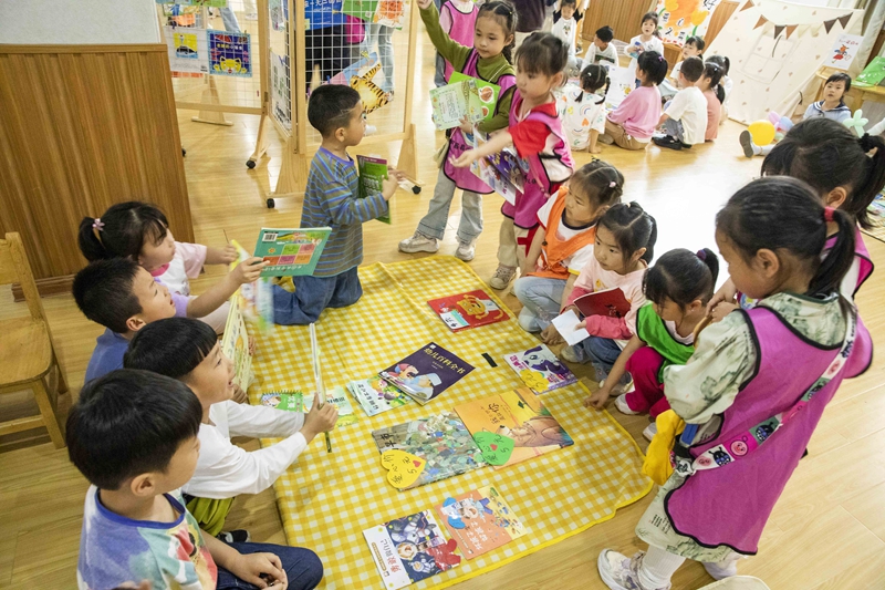 4月22日,江西省九江市都昌縣中心幼兒園的小朋友在“珍愛地球 人與自然和諧共生”主題教育活動上交換圖書。