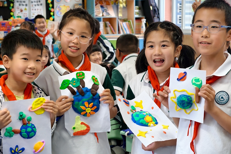 4月22日,浙江省紹興市柯橋區(qū)管寧實驗小學學生展示用廢舊材料制作的世界地球日手工作品。