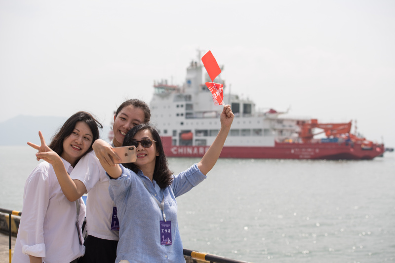 10月13日,極地科學考察破冰船“雪龍2”號抵達深圳蛇口太子灣郵輪母港,工作人員在碼頭與“雪龍2”號自拍合影。   當日,我國首艘自主建造的極地科學考察...